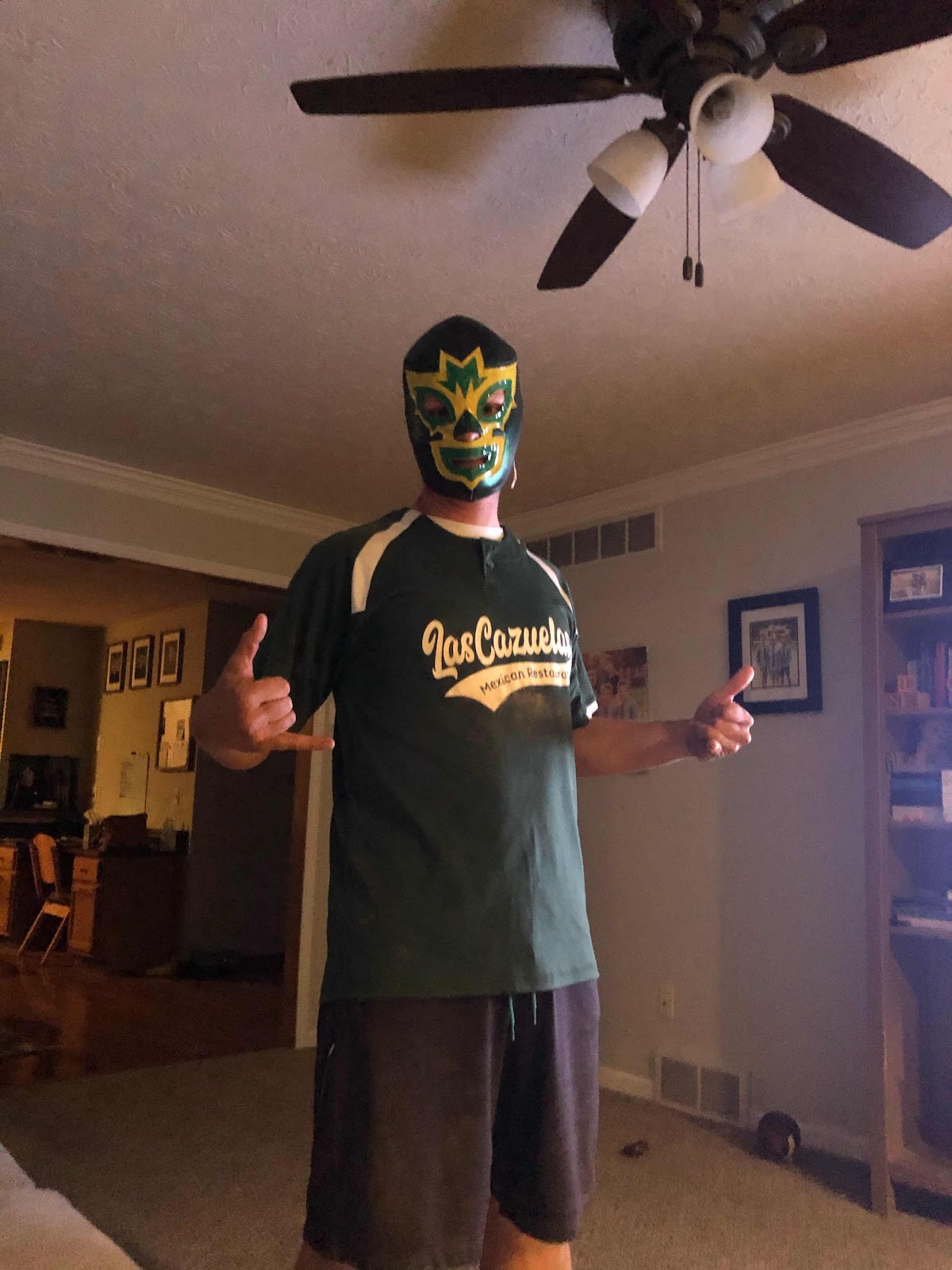 Bob continues to play adult softball in the evenings. This is a great activity for him to do. He was awarded the hustle award that game so he received the Mexican wrestling mask as his trophy.